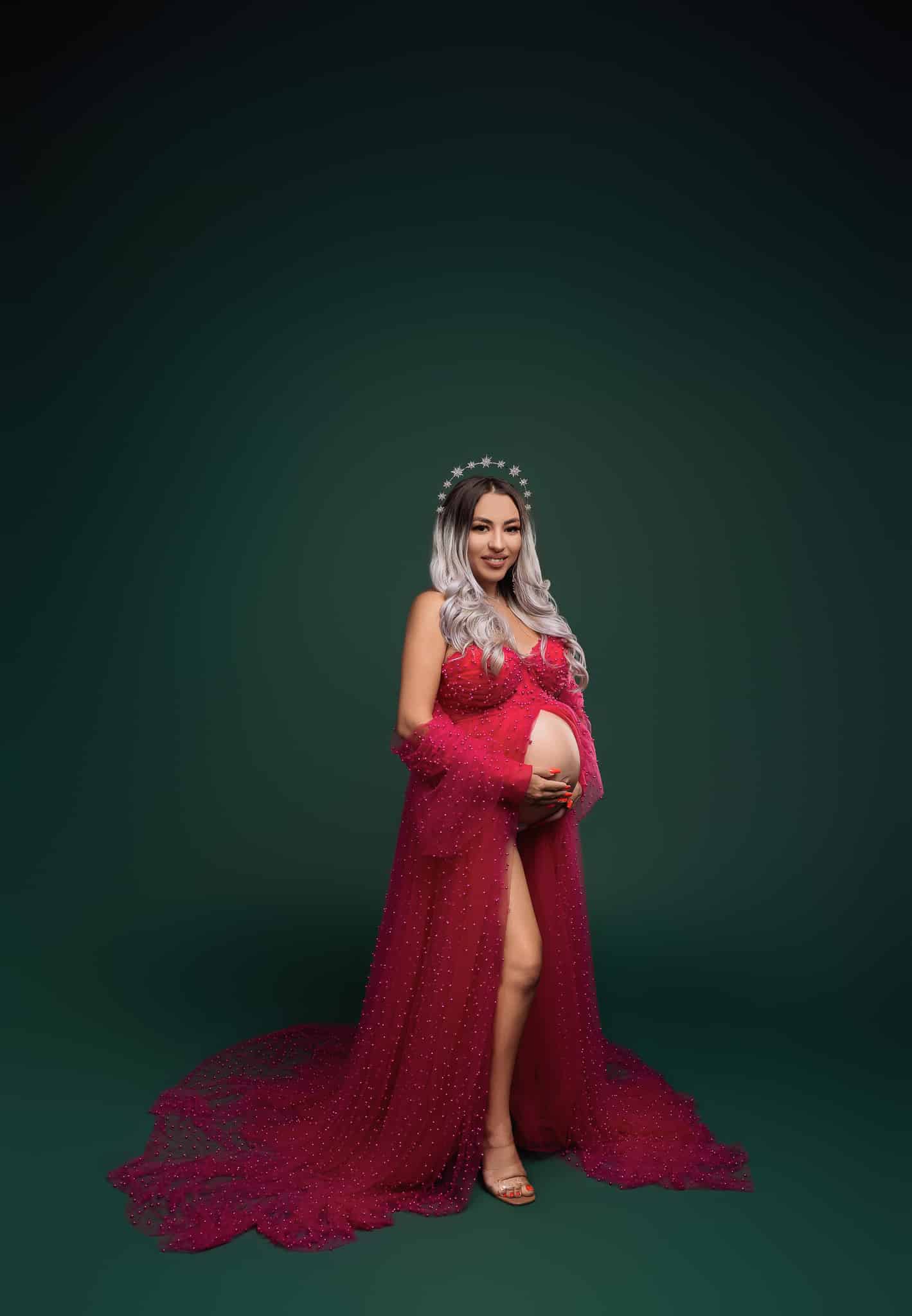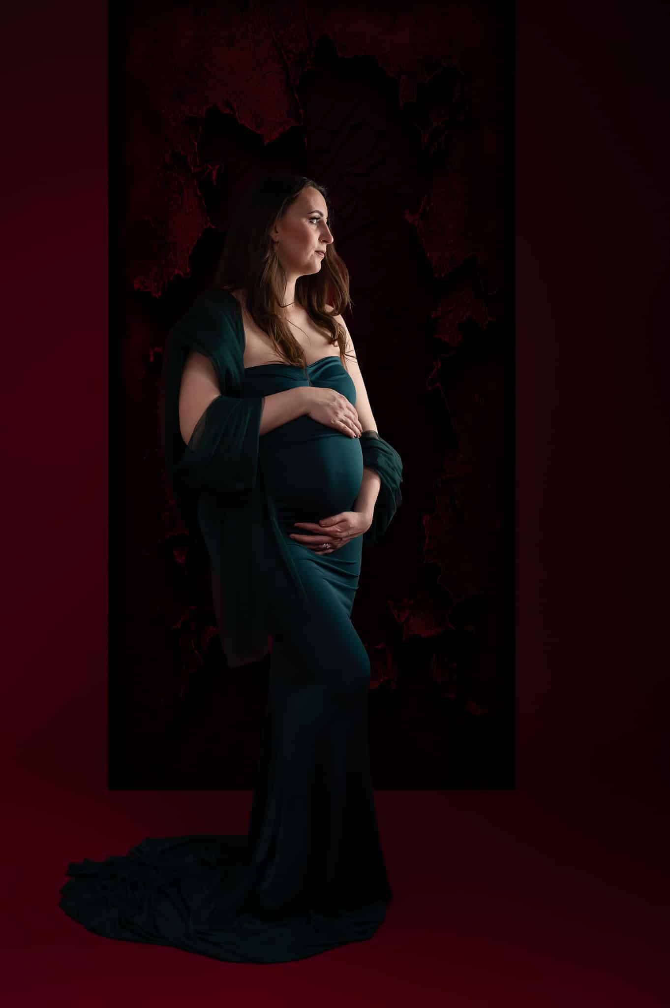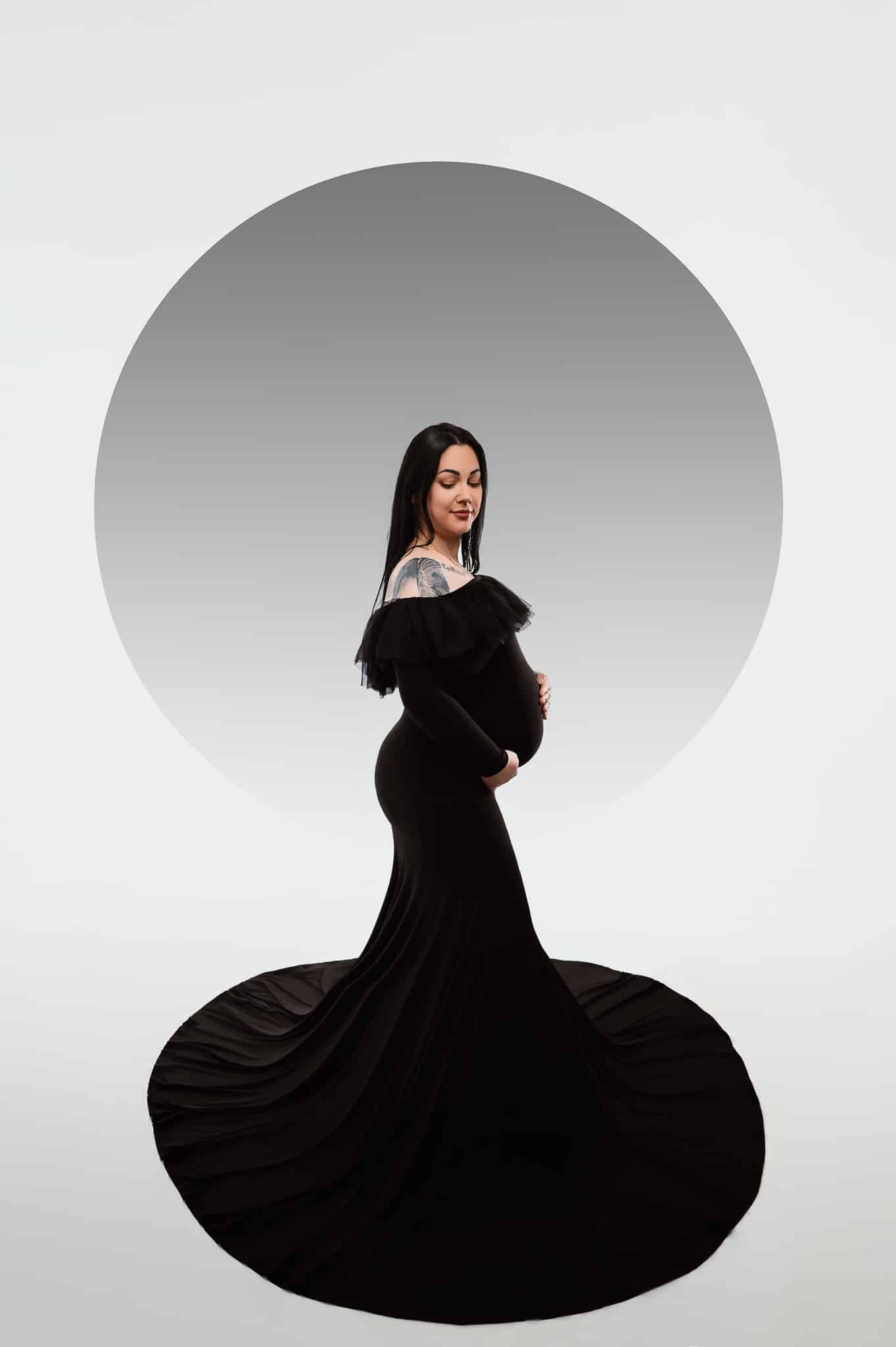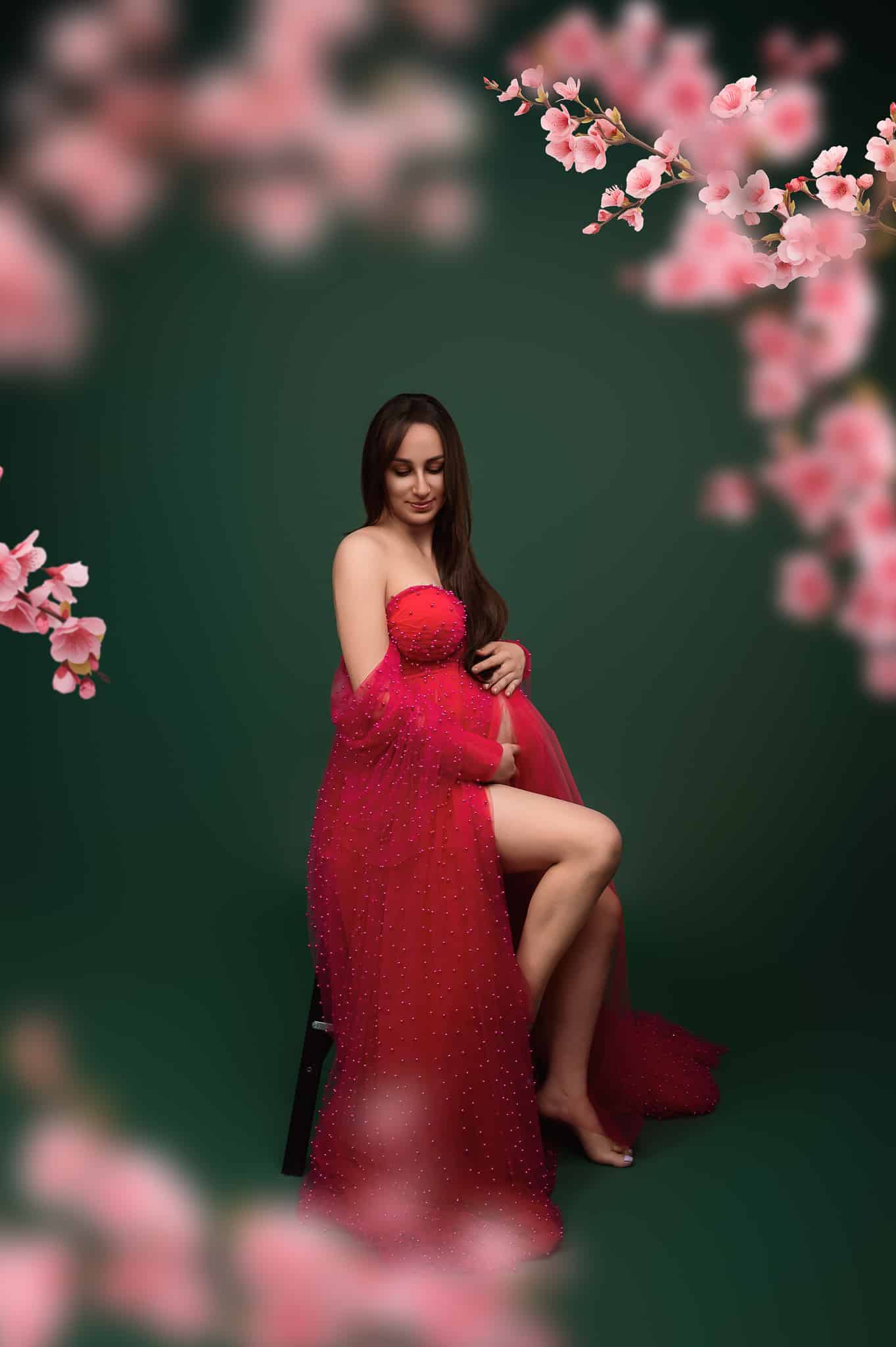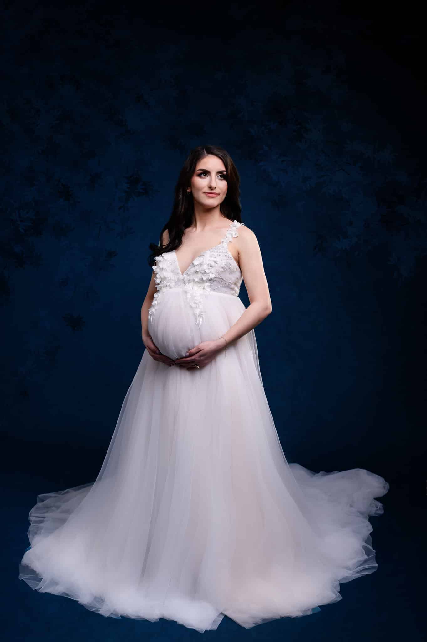 Our professional studio is equipped with everything needed for beautiful maternity portraits, including professional lighting, backgrounds, and our extensive collection of maternity dresses.