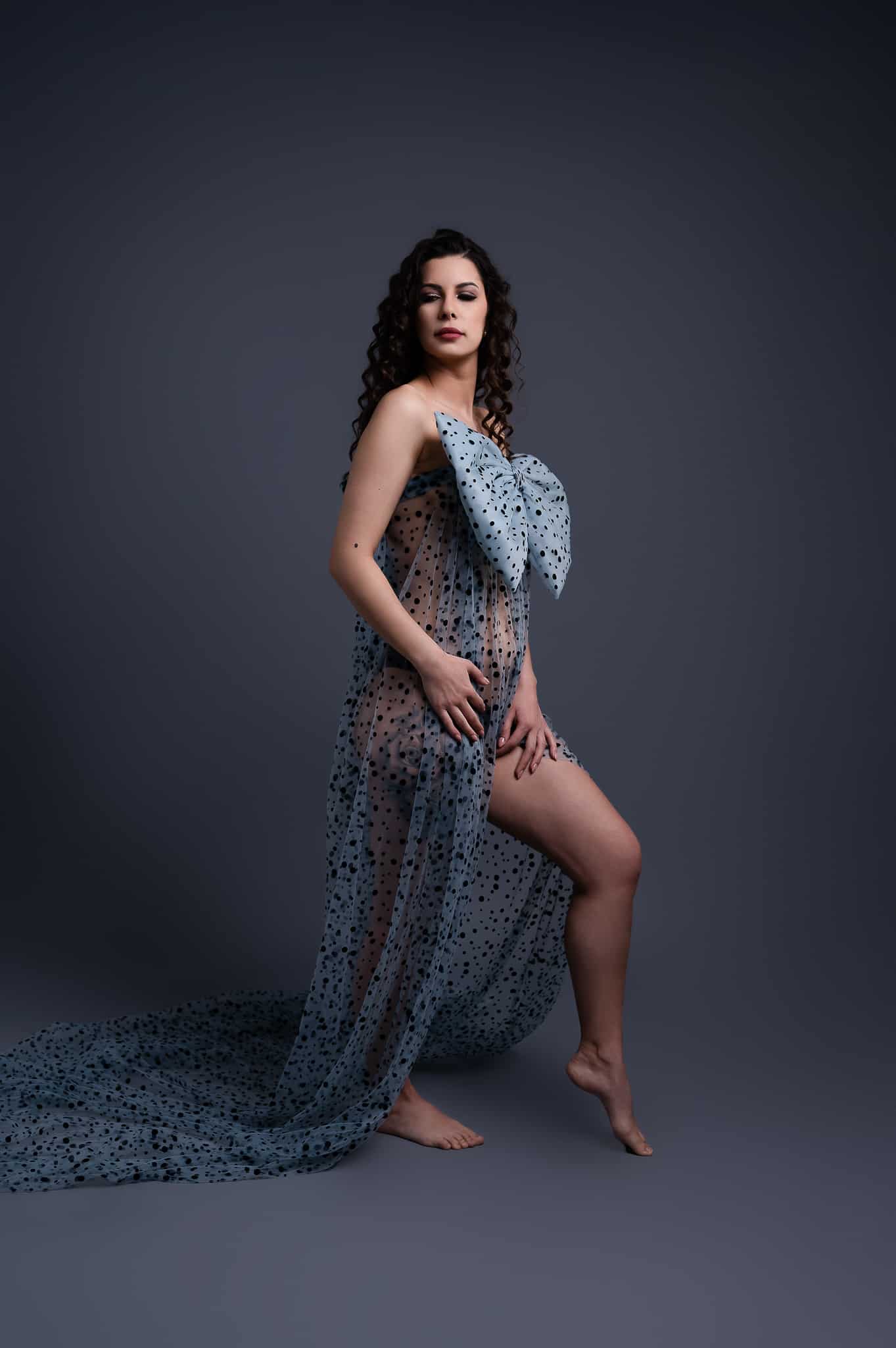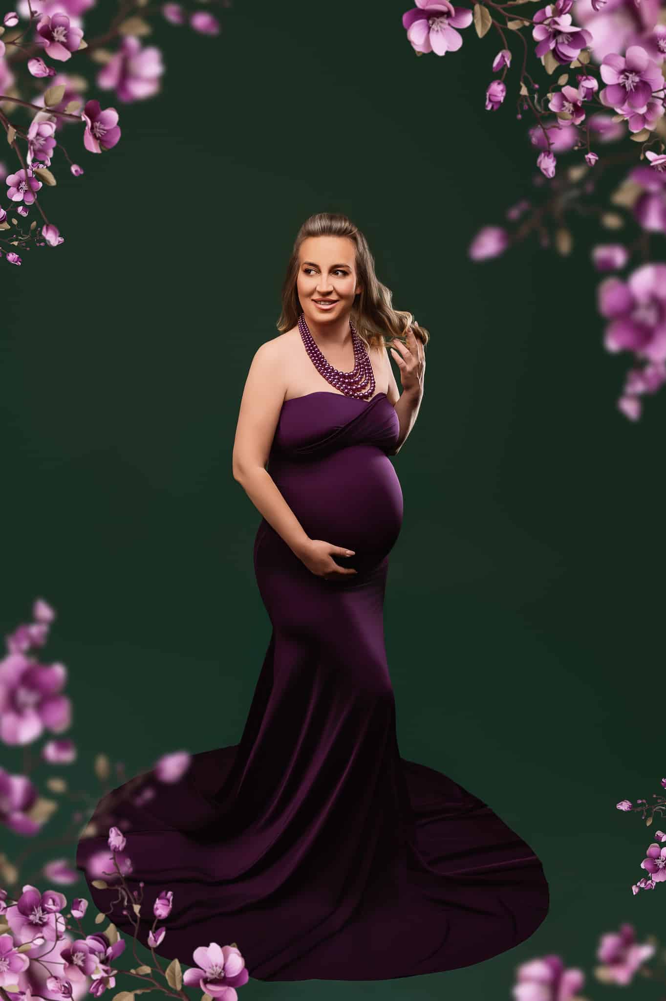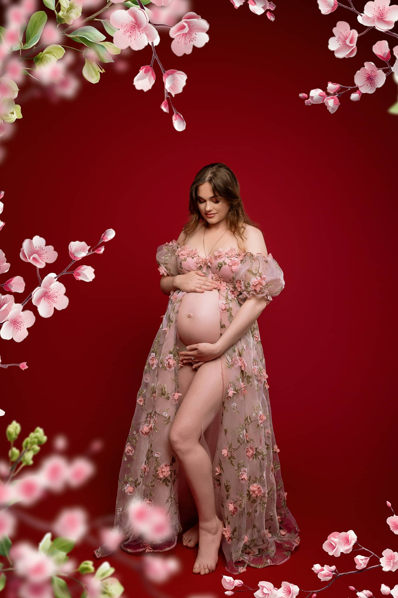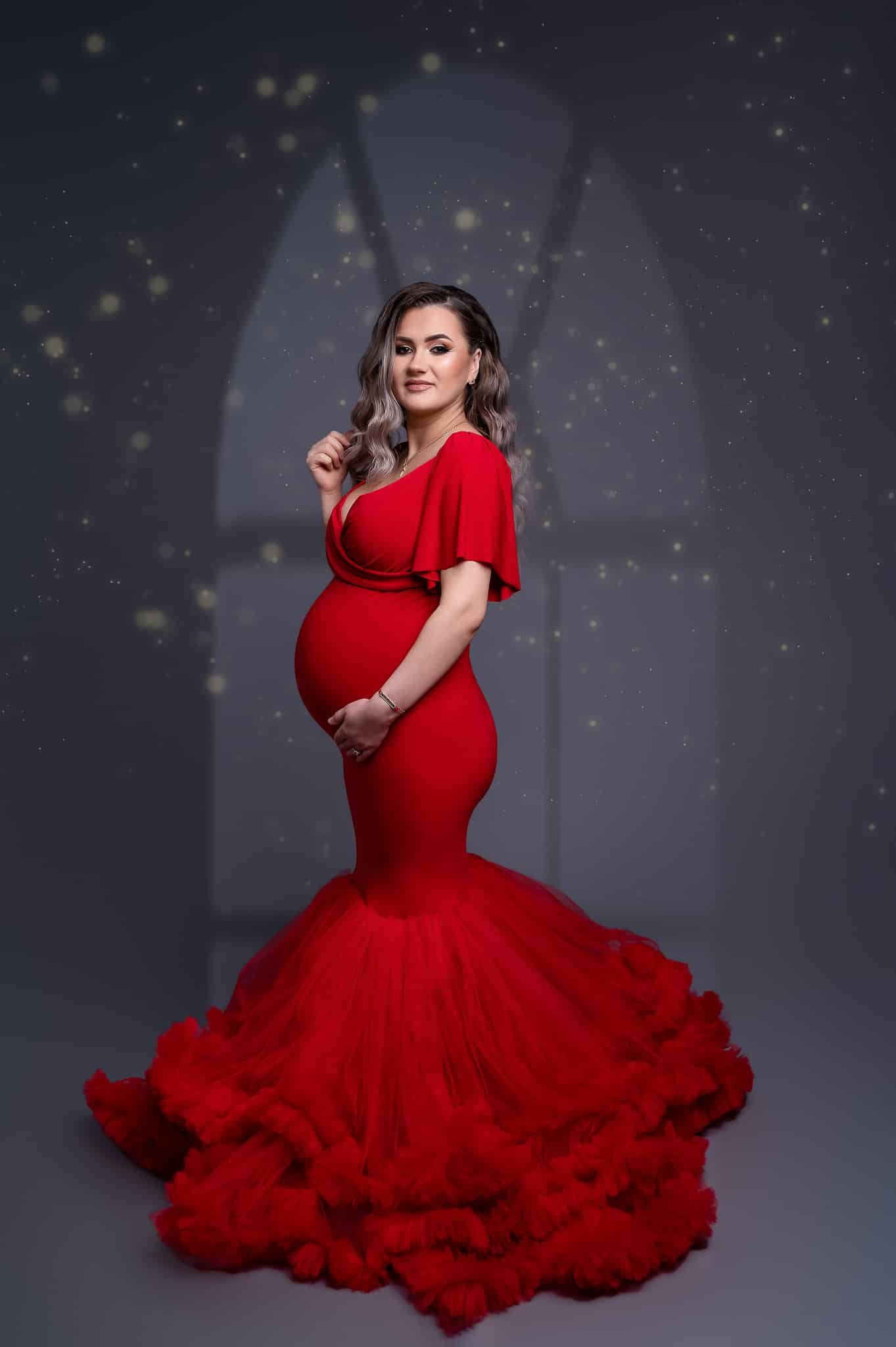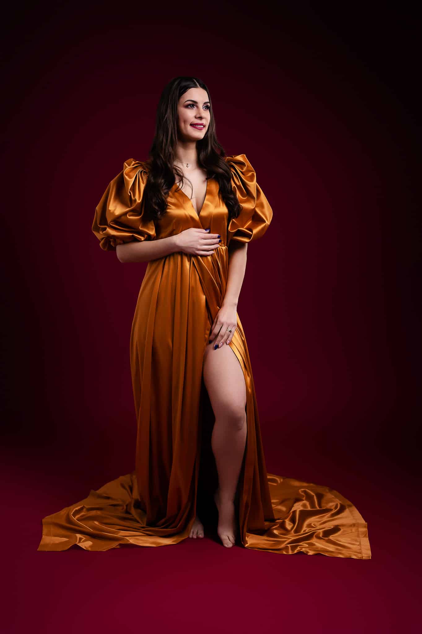 Our professional studio is equipped with everything needed for beautiful maternity portraits, including professional lighting, backgrounds, and our extensive collection of maternity dresses.
